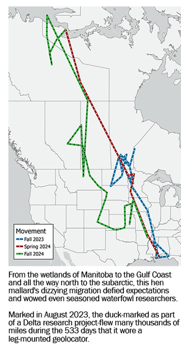 Captured near Delta Beach, Manitoba, in August 2023, a hen mallard has wowed researchers with one of the most extensive migrations ever recorded for the species using a geolocator. Recovered in Arkansas by hunter Tyler Bartlett in January 2025, the duck traversed thousands of miles of the United States and Canada during the 533 days that its geolocator—a small, leg-mounted tracking device-collected data.
