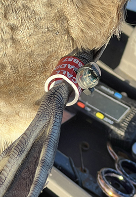 The plastic band carrying the geolocator is engraved with Delta Waterfowl’s phone number.